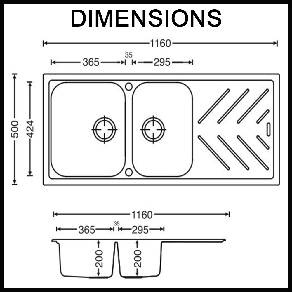 Dimensions of Sink 365mm x 424mm x 200mm (WxLxD)