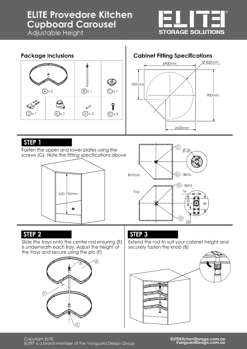 This 820mm diameter carousel fits a standard 900mm deep base cabinet or larger. Its adjustable height starts from 620mm to 750mm (internal cabinet measurement).